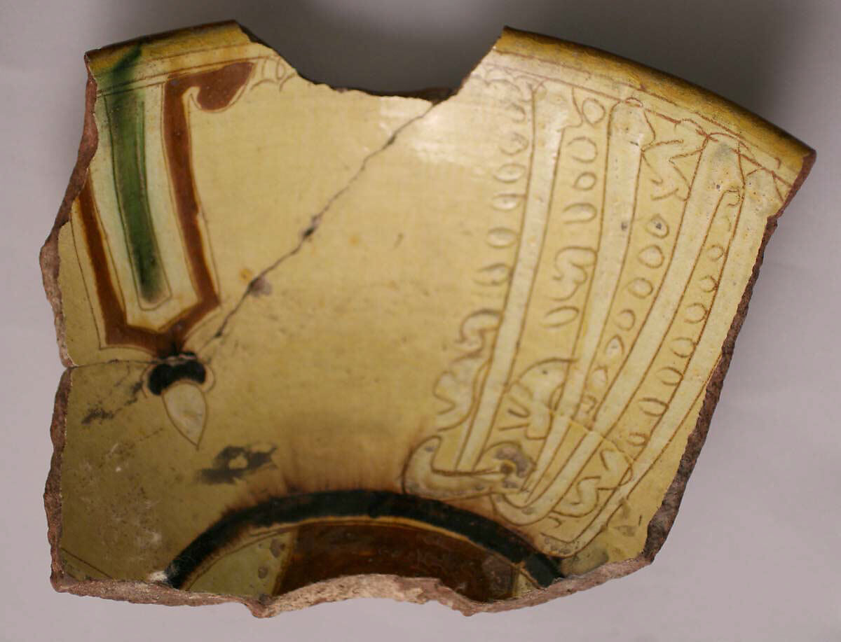 • Medium: Earthenware; incised decoration through white slip and coloring under transparent glaze