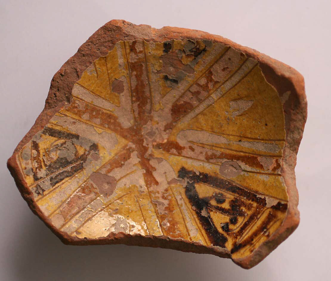 - Medium: Earthenware; incised decoration through white slip and coloring under transparent glaze