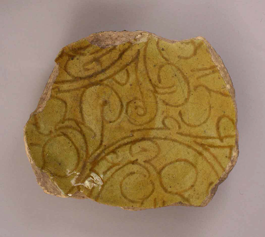 - Medium: Earthenware; incised decoration under mustard yellow glaze