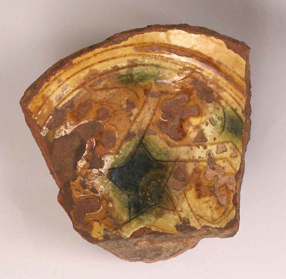 • Medium: Earthenware; incised decoration through white slip and coloring under transparent glaze