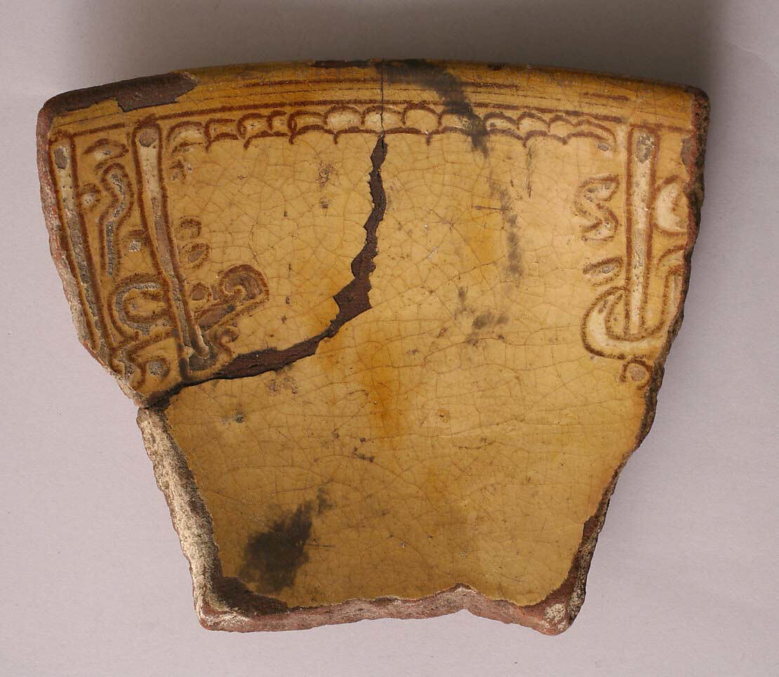 • Medium: Earthenware; incised decoration through white slip and coloring under transparent glaze