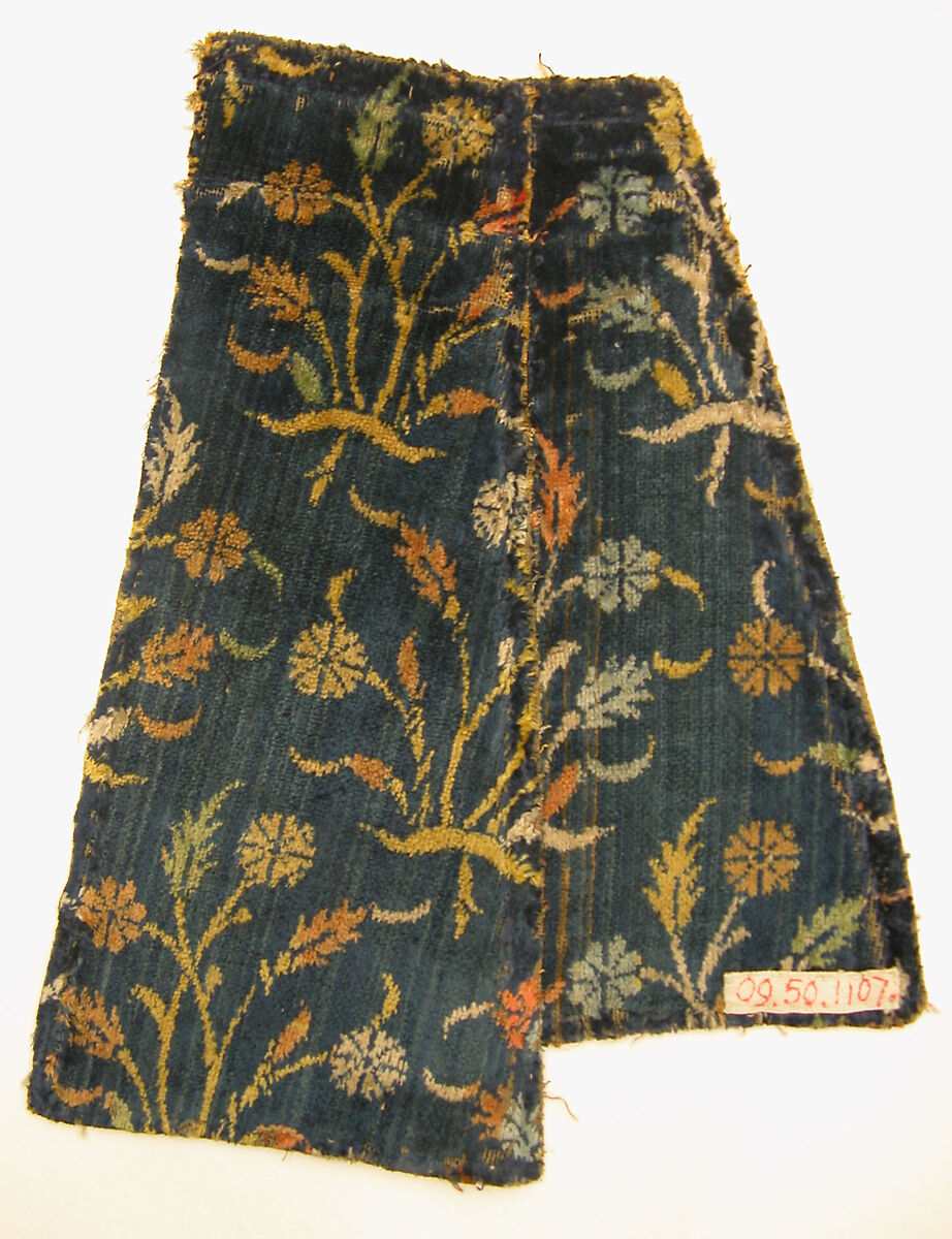 Silk velvets were produced in Iran in the sixteenth and seventeenth centuries for export to Europe as luxury goods. They were often used as garments and household furnishings and cherished by Iranian and European consumers alike for their supple texture. These fragments feature staggered rows of flowering plants in yellow, orange and pink against a dark blue ground. Similar floral motifs appear on textiles, tile work and other decorative media during the Safavid era, attesting to the popularity of the garden as a favorite theme.