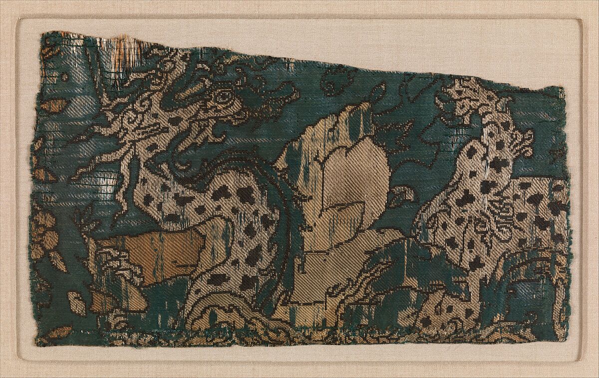 This textile fragment depicts a dramatic image of a dragon moving among jagged rocks. In its complete form, it originally would have also depicted a hunter aiming a large rock at the dragon. The dragon was a popular subject for miniature painters, upon whose illustrations textiles like this one were based. The design of this example is brilliantly conceived; a highly skilled artist must have designed the cartoon for this ferocious scene of the mythical monster.