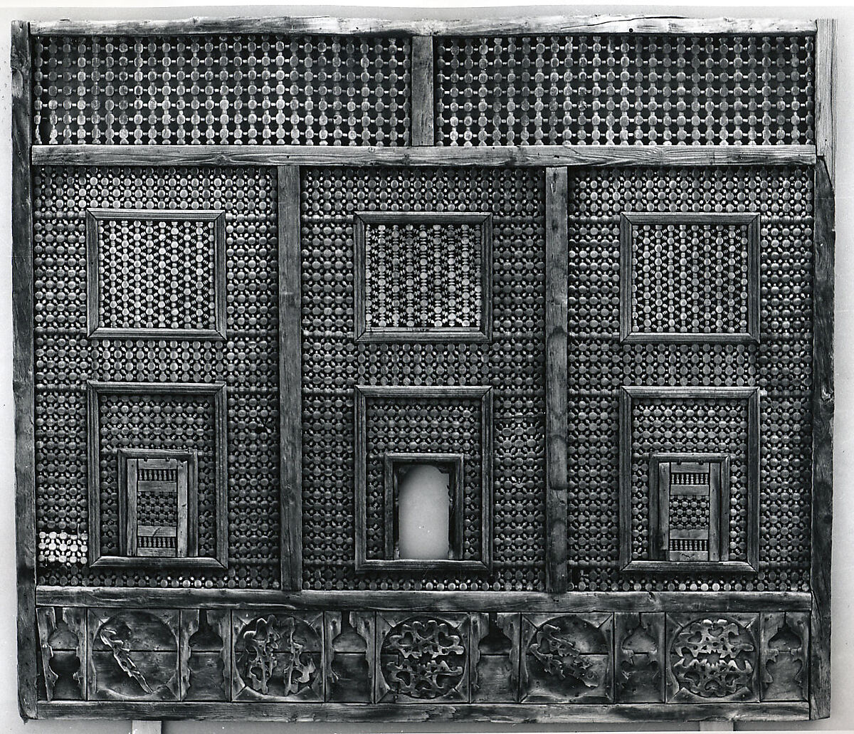 This masterful flat screen is made of large and small panels of turned lattice-work in various designs above a solid base with medallions. These medallions are carved in high relief with interlacing arabesque, recalling embroidery in textiles. The wide spaces between the mashrabiya elements at the top improved the ventilation of the interior space.