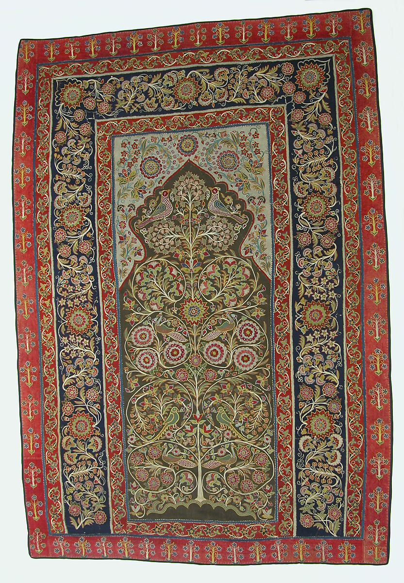 Traditionally, the chain stitch (gulab-duzi) was used in much Persian embroidery. The Caspian city of Rasht was known to have supplied the Safavid court at Ardebil and excelled at the art, hence Rasht embroidery (rashti-duzi) developed into a unique craft. Executed by male professional embroiderers in well-organized workshops, the panels were characterized by the use of felted flannel wool (face cloth, often used in military uniforms of the region) for the ground. The designs were pounced with powdered chalk, and chain stitched in firmly twisted colored silks using metal crochet hooks. As in the present hanging, the outer borders were often patched bands of different colors, elaborately worked in a riot of colors. The unique charm of this prayer-niche hanging, however, is in the elegant rendition of the meditative tree design, replete with Sufi symbolism. The layered, symmetrical tree alludes to the stages (maqamat) of Sufism, while the birds, creatures that link the Earth and the Heavens, symbolize the divine guidance in the ascent of the believer's soul in prayer.