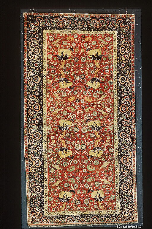 This carpet comes from the shrine of Shaikh Safi at Ardabil, the dynastic shrine of the Safavids. The shrine attracted gifts from royalty, including the most famous pair of carpets from the mid-sixteenth century, made for a prayer hall commissioned by Shah Tahmasp (r. 1524–76). With its pairs of lions attacking stags, tigers, hares, bears, foxes and wolves across a field of vines and blossoms, this carpet,would not have been used in spaces designated for prayer. Instead, it may have served as a floor covering in the refectory of dormitory.