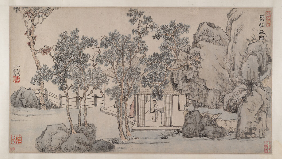 Wen Zhengming painted The Cassia Grove Studio to celebrate the success of a fellow scholar, Zheng Zichong, at passing the civil-service examination. "Plucking the cassia" was a metaphor for such success. A fall flower, the cassia was usually associated with the provincial examinations, traditionally held in the autumn. The red vine leaves identify this as an autumnal scene.