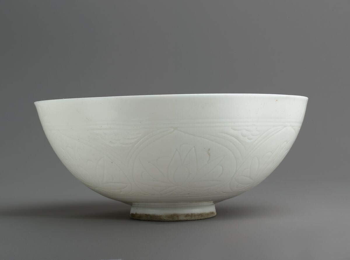 This bowl with its rounded sides, plain lip, and short foot, is probably modeled on Chinese lien-tzu (lotus seed bowls, and is ornamented with a band of elaborately incised design of six medallions containing lotus leaves and blossoms-- decorative details which are also of Chinese origin
