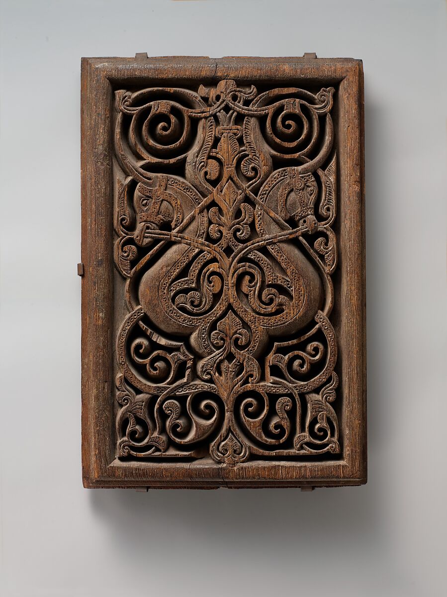 ELLEN KENNY: Hi, I'm Ellen Kenney. I'm a Research Associate in the Department of Islamic Art. And we're here looking at a wooden panel, which dates to the Fatimid period, and comes from the Fatimid capital of Cairo. Perhaps surprisingly, we find that wood was used fairly widely in the architecture of the Fatimid period, even though it would have been a rather expensive commodity, and often had to be imported. So I think we have to think of wood in the context of Fatimid Cairo as a luxury material, rather than something sort of mundane. I love this panel; the way these horse heads sort of morph into an arabesque - almost like a seahorse. And then the arabesque morphs into the spiraling background. It's just a delightful piece. So you have on the one hand this very deep carving, making a real contrast of light and dark… And then at another level a lot of the detail like the serration on the arabesque leaves, and… the decoration on the bridal, and the horse's mane and eyes are very gently etched in a way into the wood. And so ultimately this gives us… a real sense of richness, but with both this sort of gentle etching and the deep carving in combination.