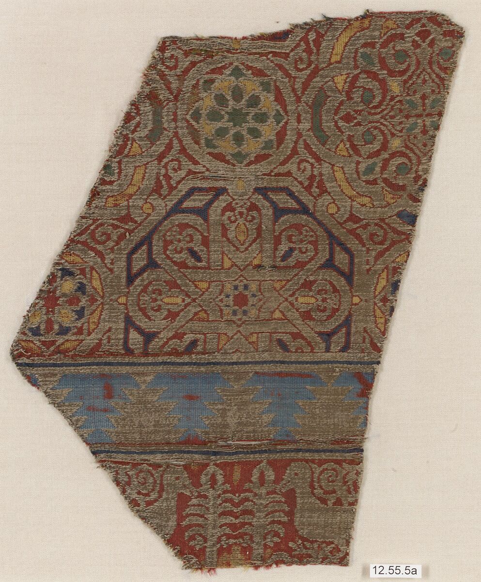 This textile fragment and is ornamented with circular medallions containing eight-pointed stars and large multi-lobed arabesques, alternating pyramidal merlons, and stylized palm trees flanked by confronting birds.