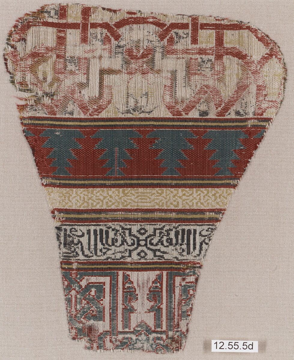 This silk textile fragment is divided into horizontal bands, decorated with interlaced knots, alternating blue-gray and red pyramidal merlons, horizontal stripes and an Arabic inscription in black Kufic lettering.