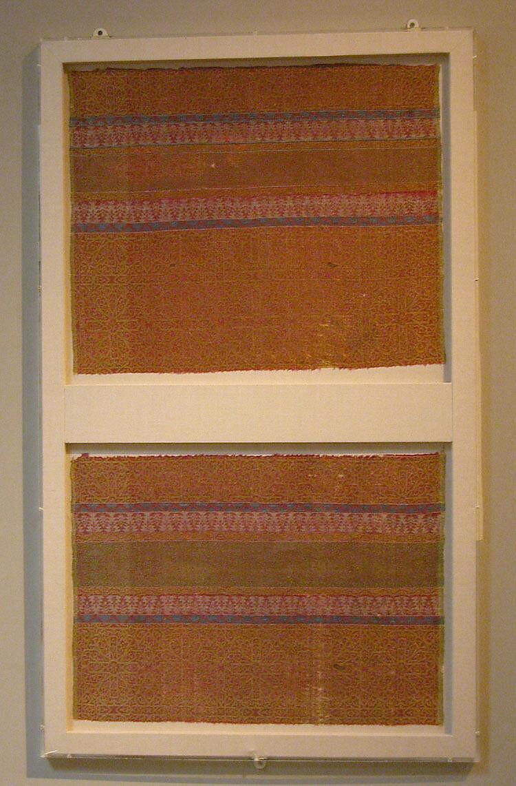 Geometric designs such as the ones in this fragment are found ornamenting a wide variety of media produced in Nasrid period (1232–1492) Spain, including tile work, woodwork, book binding, and painted stucco. Such colorful geometric designs also recall the famous wall patterns in the Alhambra palace in Granada. In both the plaster and tile work of the buildings in the palace, interlacery designs are closely related to this weaving.