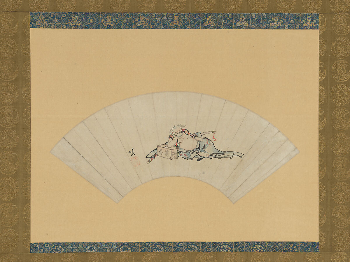 Hokusai's extraordinary achievement in print art has overshadowed his great talent as a painter. In this painting, Asaina Saburō, the legendary hero of Herculean strength, is enshrined in the small domain of the fan, so that his image takes on a more iconic quality. This fan, which was actually used, might have been a New Year's gift from a sake shop called Tsuruya, the name that appears on the box on which the drunken Asaina reclines. If this is the case, Hokusai created a witty, auspicious image for the shop. On the left is the signature Hokusai, which is accompanied by an unclear seal.