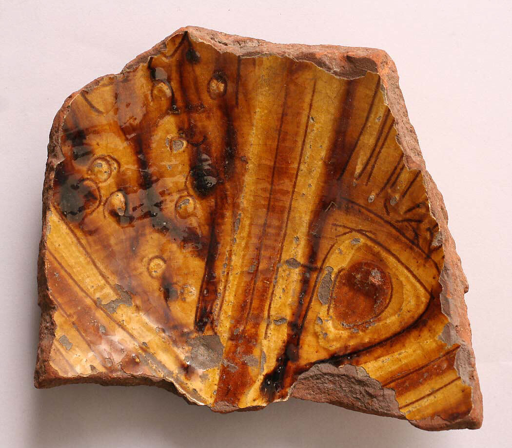 - Medium: Earthenware; incised decoration through white slip and coloring under transparent glaze