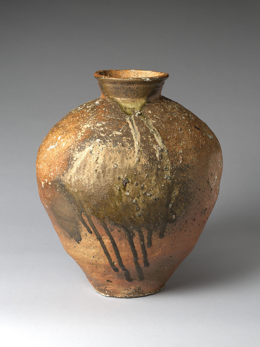 Massive Shigaraki jars—named for the valley of their production—are among the most compelling ceramic works of Japan’s medieval period. This one was constructed in four sections, gradually building up thick coils of clay to form the torso and wide shoulders. The grayish-white material is rich in iron and feldspar, a composition characteristic of Shigaraki and thus imparting a local flavor. In the kiln, it turns a reddish-brown color—this well-fired example shows a warm, deep tone across its unglazed body—while the melting of grains of feldspar speckles the exterior with small white dots that lend texture to the vessel’s powerful form. On the fire-facing side of this jar, a layer of dark-green natural wood ash glaze has formed, including streaks descending from the neck to the base. The “landscape” of the surface is a collaboration among the clay, the wood-fired kiln, and the potter’s hand.