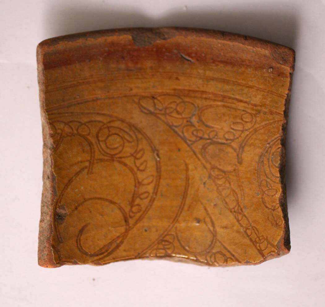 - Medium: Earthenware; incised decoration through white slip and coloring under transparent glaze