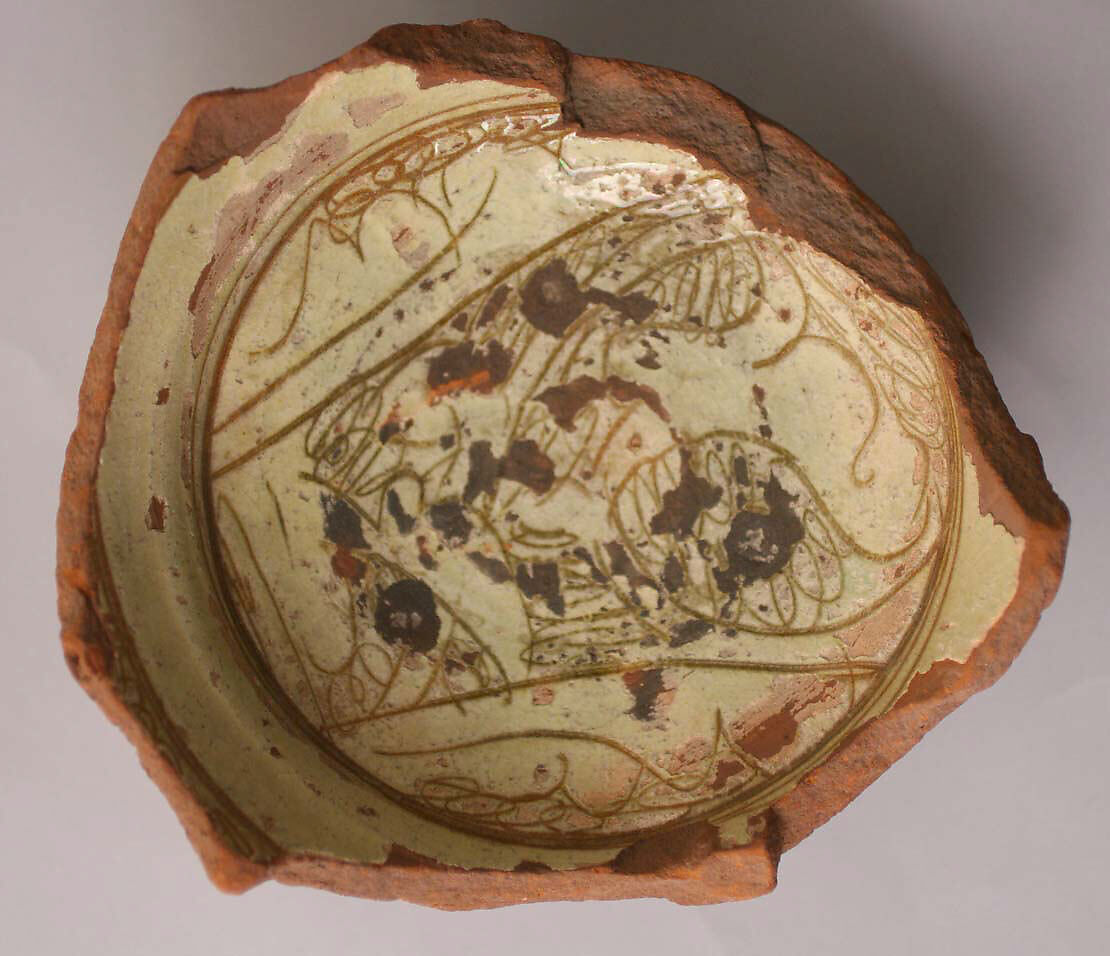 - Medium: Earthenware; incised decoration through white slip and coloring under transparent glaze