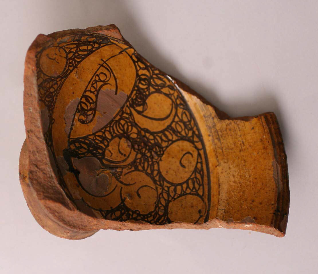 - Medium: Earthenware; incised decoration through white slip and coloring under transparent glaze.