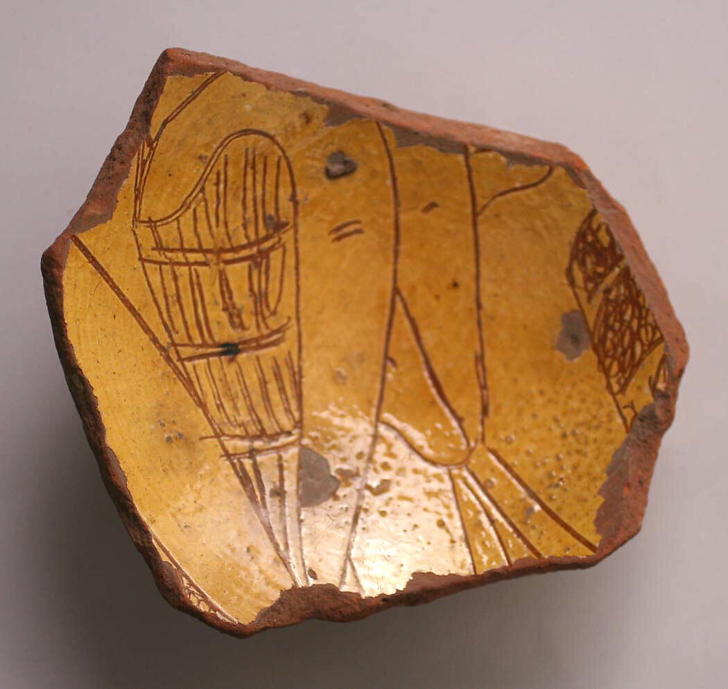 - Medium: Earthenware; incised decoration through white slip and coloring under transparent glaze.