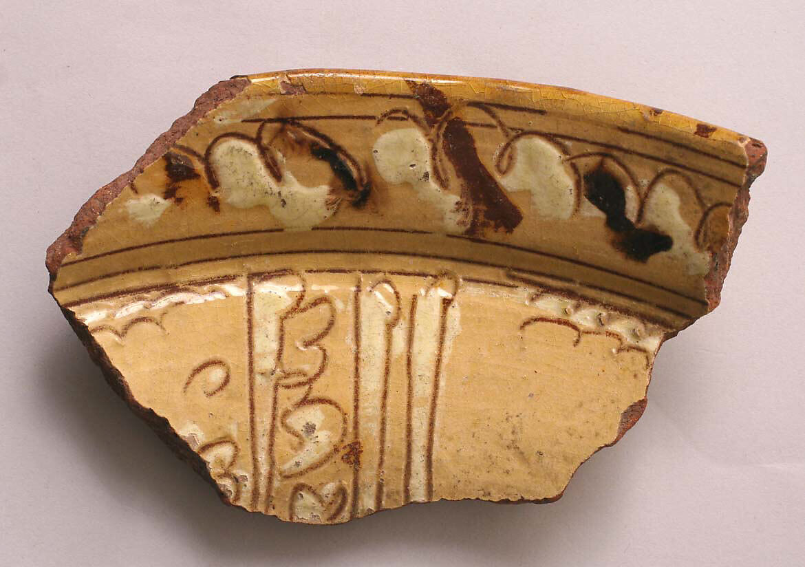 - Medium:Earthenware; incised decoration through white slip and coloring under transparent glaze