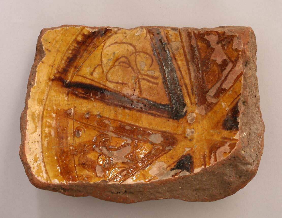 - Medium: Earthenware; incised decoration through white slip and coloring under transparent glaze