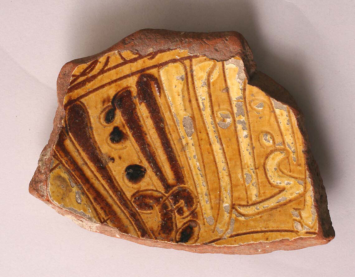 - Medium: Earthenware; incised decoration through white slip and coloring under transparent glaze
