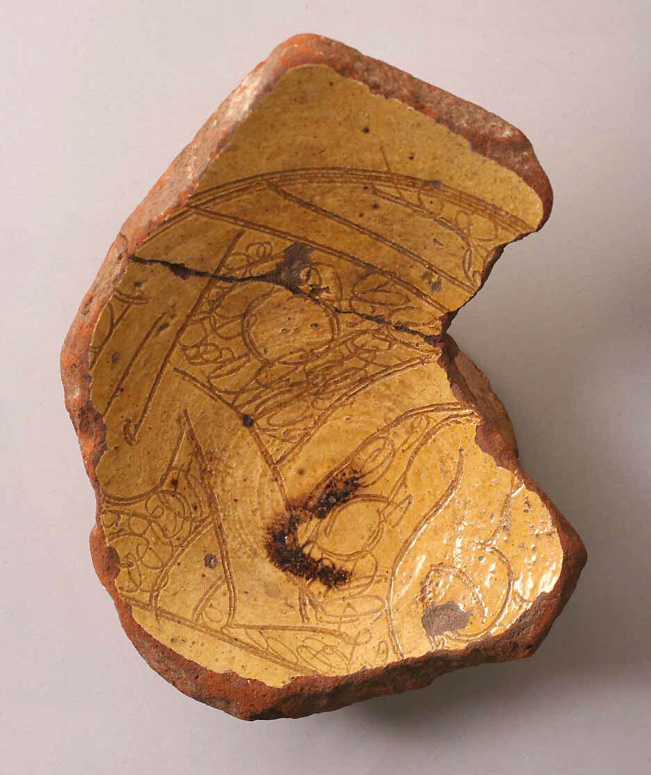- Medium:Earthenware; incised decoration through white slip and coloring under transparent glaze