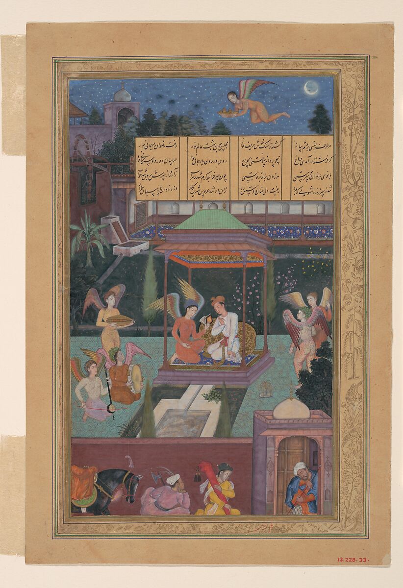 Approximately one century after the Persian poet Nizami wrote his Khamsa (Quintet), the Indian poet Amir Khusrau Dihlavi composed a response using Nizami’s structure but varying his stories slightly. This painting comes from the Mughal emperor Akbar’s (r. 1550–1605) copy of Amir Khusrau’s verses. It depicts a story told by a princess to the king Bahram Gur, about a youth and the fairy queen he imagines meeting nightly in a lush garden.