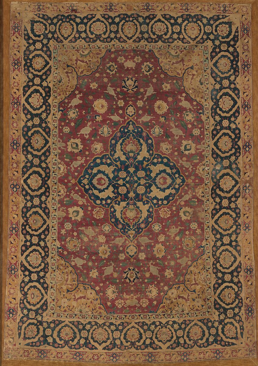 This carpet, possibly woven in the silk trade and carpet manufacturing center of Kashan, has a dark blue quatrefoil medallion at its center. Decorative elements on this and other related carpets from Kashan and Tabriz indicate that weavers may have used pattern books containing popular motifs to guide them in production. These designs are also present in other media, particularly in the arts of the book. The use of metal-wrapped thread in a silk Kashani carpet of this size is unusual, but the high knot count of about 600 knots per inch may have made this expensive material worth its cost given the fine quality of the work.