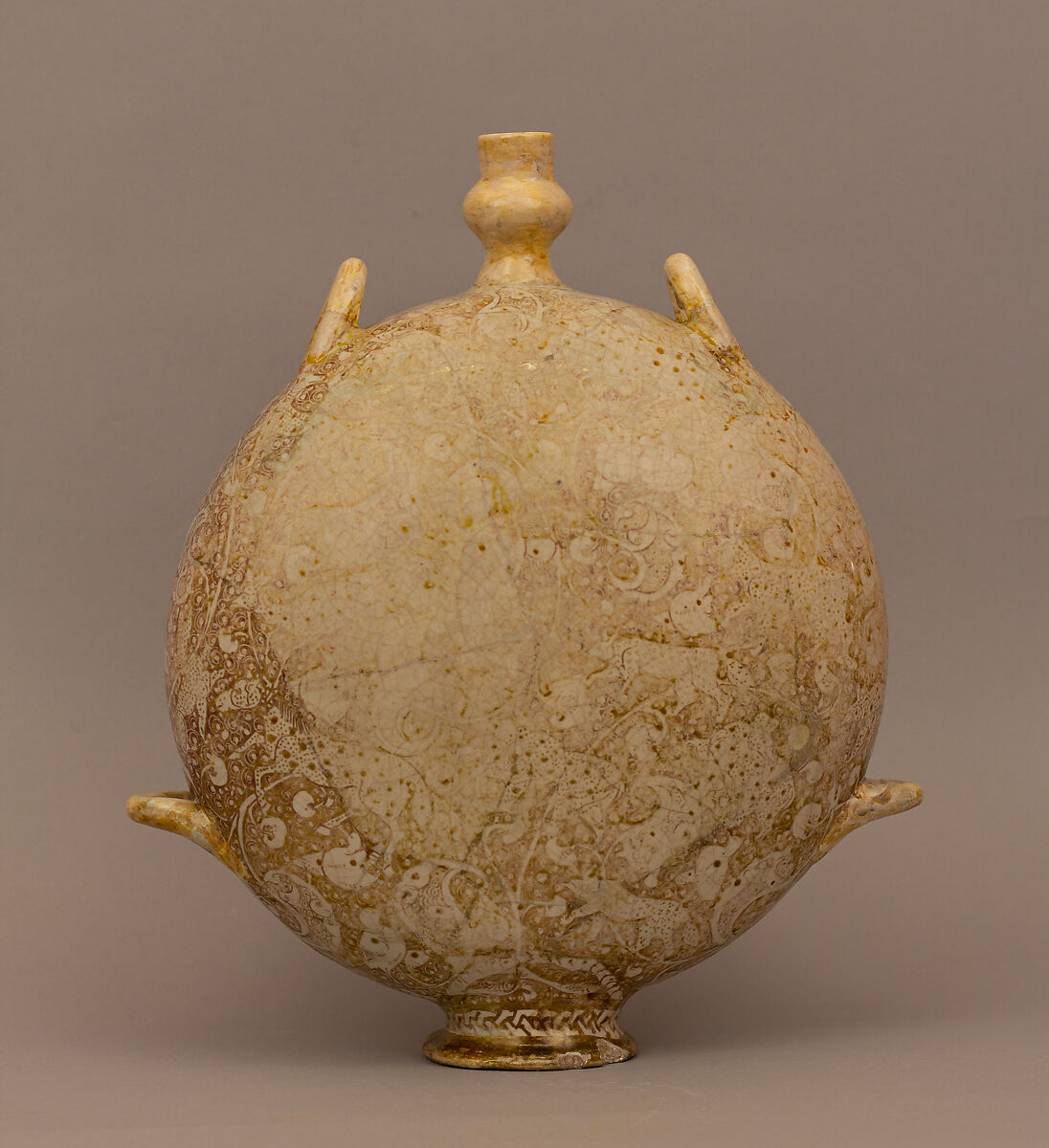 Only a closer look at this faded lusterware flask reveals its bevy of masterfully painted creatures.