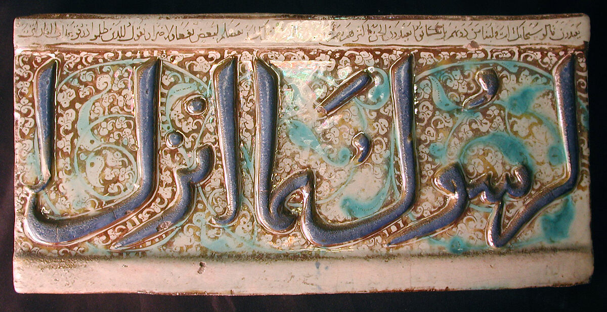 Once part of a calligraphic frieze within a tomb or religious structure, this tile holds three lines of religious text. Executed in thuluth script, the raised writing of the central band includes the word "the Messenger" and is part of a Qur’anic verse from Sura 2 (The Cow), verse 285. The calligraphic inscriptions painted in luster above and below are from other sections of the Qur’an, although most of the luster on the lower register has worn off. Perhaps set at eye level above a dado of geometric tiles, the full group once formed a continuous band of text. A total of twenty tiles from this frieze are known to exist, including eight in the Museum’s collection.