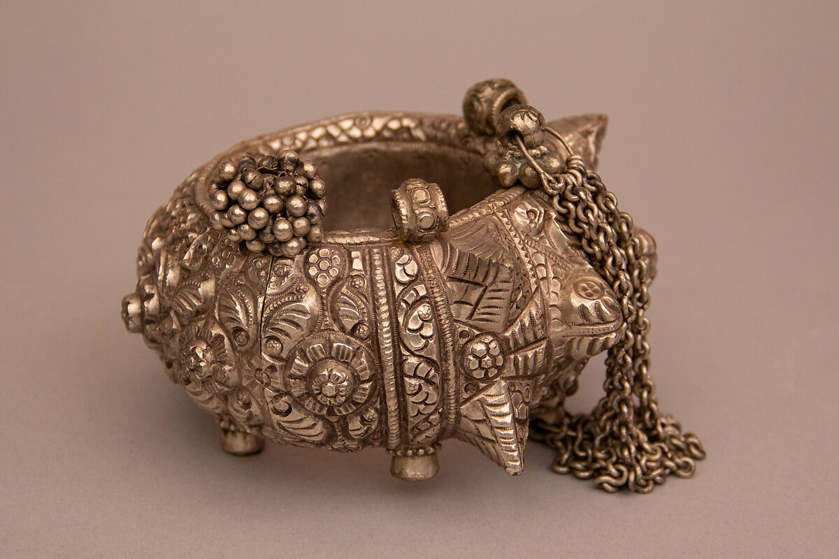 These large and heavy anklets were worn as part of a suite of jewelry by women in the state of Gujarat. They are ornamented with floral and vegetal motifs which are typical of Indian jewelry. The chain and cluster of balls would have created a musical noise as the wearer moved wearing these jewels.