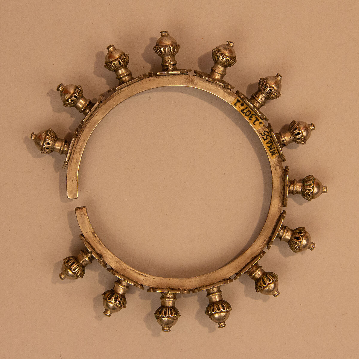 Spikey bangles are known to have served as weapons as well as adornment and were worn by men and women alike. This silver example is adorned with bud-like forms on the exterior. Along with other plant components such as flowers, leaves, and vines, such forms are often found ornamenting Indian jewelry.