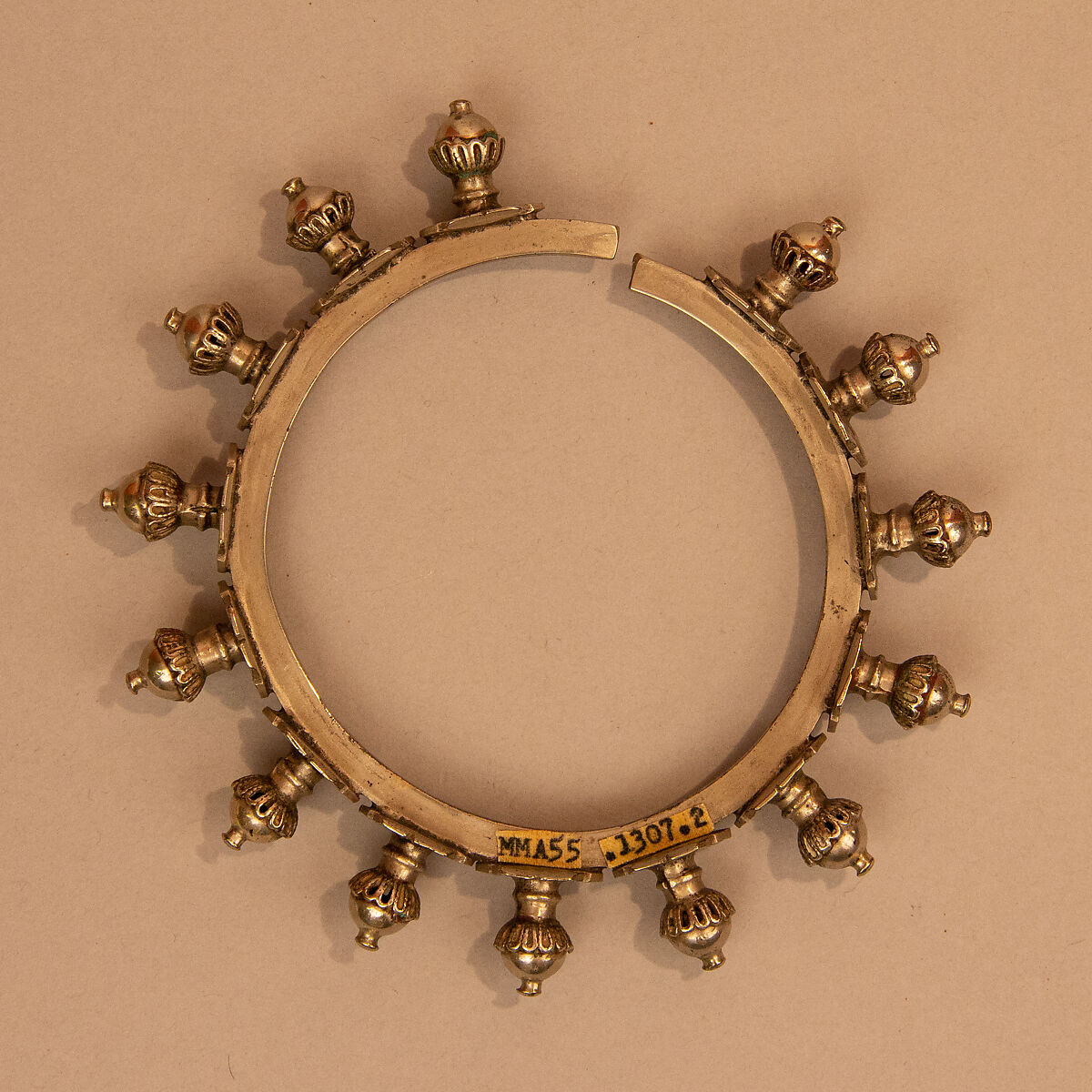 Spikey bangles are known to have served as weapons as well as adornment and were worn by men and women alike. This silver example is adorned with bud-like forms on the exterior. Along with other plant components such as flowers, leaves, and vines, such forms are often found ornamenting Indian jewelry.