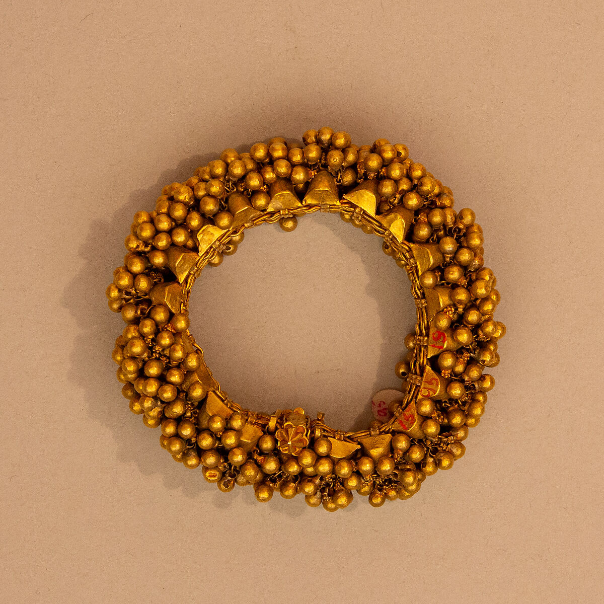 These gold anklets are made up of many small articulated balls that would jingle and move alongside the wearer. Such jewels would have been worn in the areas of Rajasthan, Malwa, and Madhya Pradesh as part of a suite of jewelry. The use of gold in these pieces indicates that these jewels were made for a person of privilege.