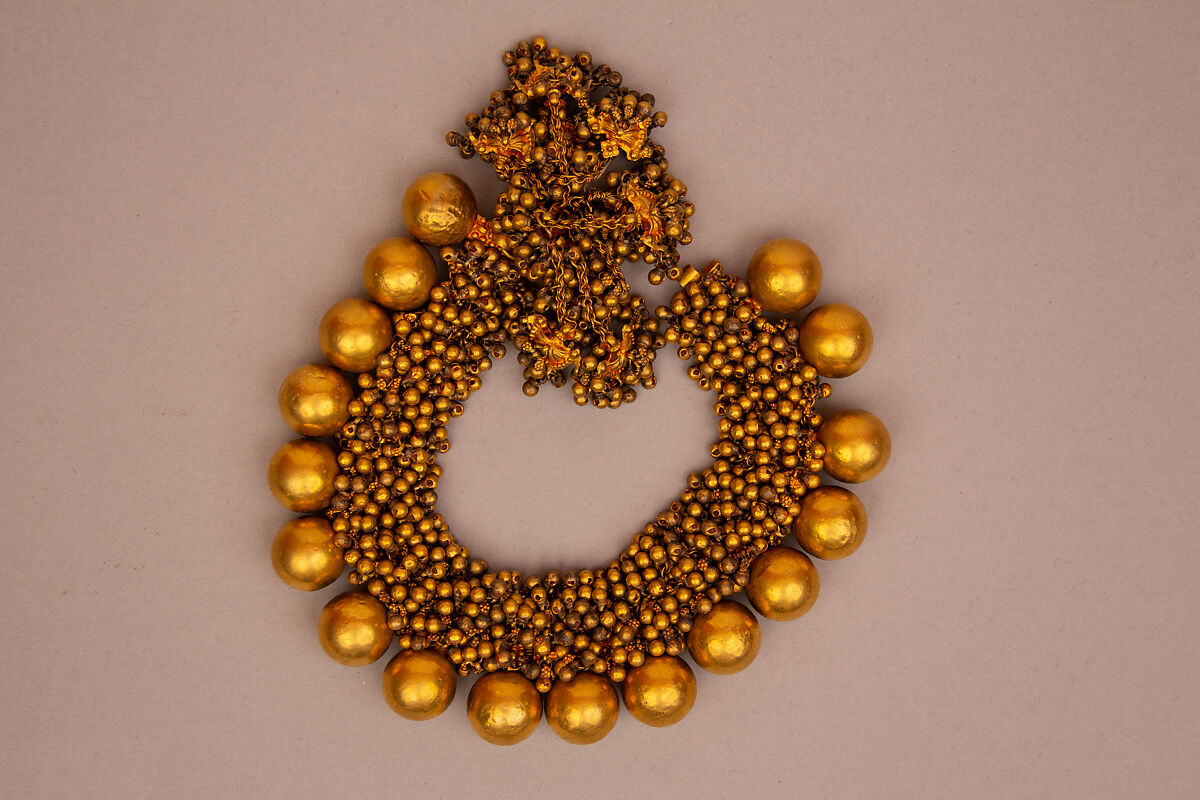 These gold anklets are made up of many small articulated balls that would jingle and move alongside the wearer. One of the anklets is fitted with bells on the tassel. Such jewels would have been worn in the areas of Rajasthan, Malwa, and Madhya Pradesh as part of a suite of jewelry. The use of gold in these pieces indicates that these jewels were made for a person of privilege.