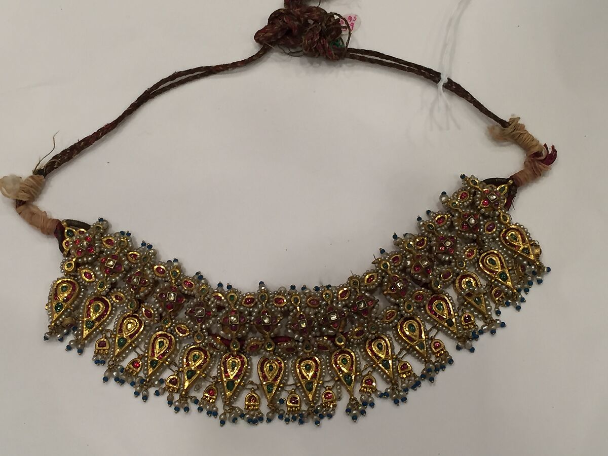 This type of necklace would have been worn snug around the throat, and was known as a guluband. As part of a larger suite of jewels, the colorful gemstones and gold in this necklace would have contributed to a vibrant ensemble of ornament.
