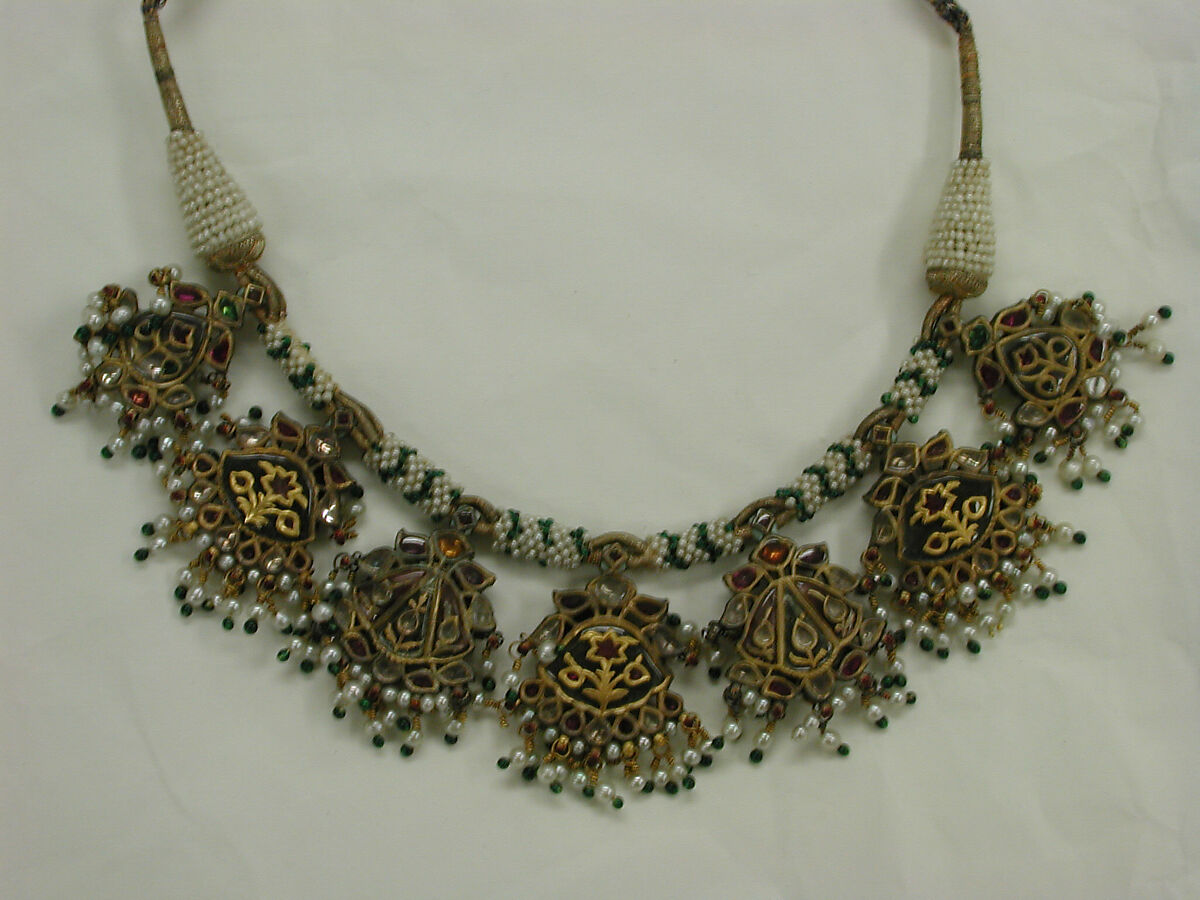 The practice of inlaying hardstones with gold and precious gemstones was a common artistic technique in jeweled arts from Mughal India. The seven rock crystal pendants of this necklace have been crafted in this technique, and here are inlaid with gold, rubies, sapphires, and quartz. Tiny seed pearls and emerald beads are suspended from the pendants, and the verso is ornamented with high quality meenakari, or enameling with red and green on a white ground. This particular palette was a specialty of Jaipur, the probable location where this piece was made.