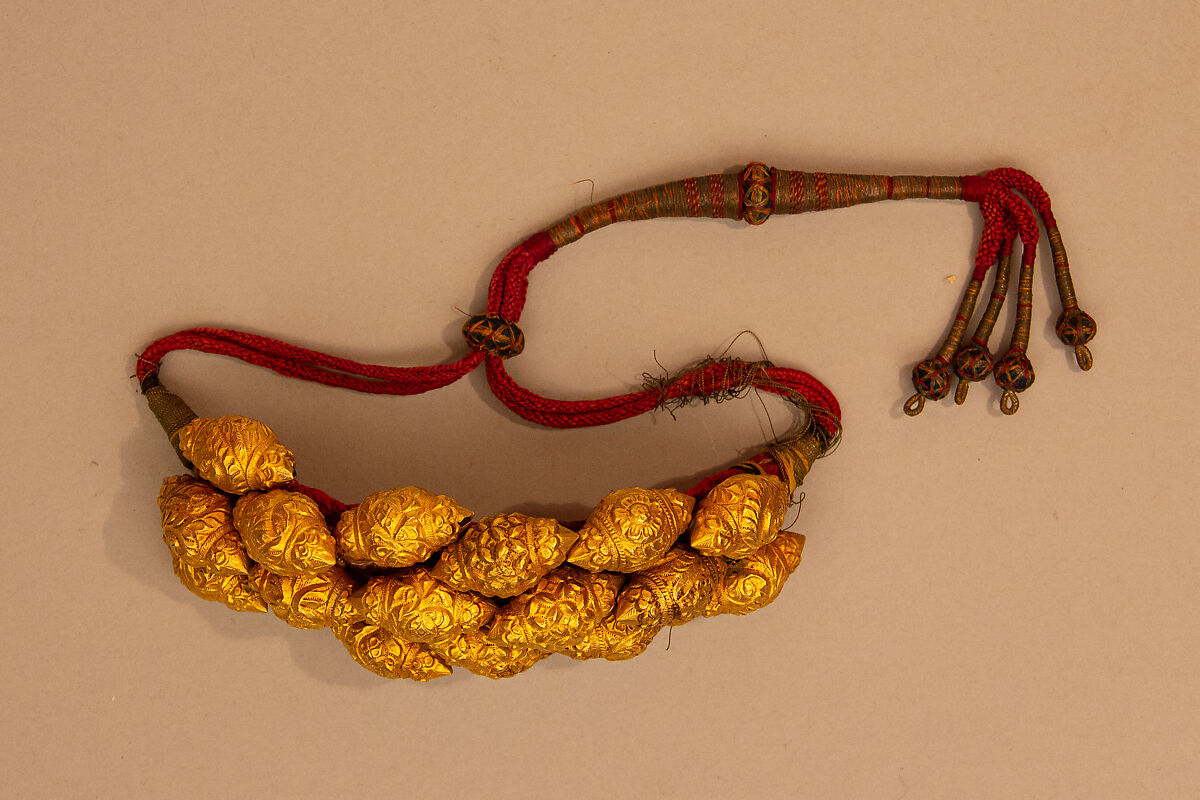 This bazuband or arm band is decorated on the exterior with bud-shaped ornaments. These small motifs can be interpreted as symbols of reproduction and fertility. Along with other plant components such as flowers, leaves, and vines, such forms are often found ornamenting Indian jewelry.