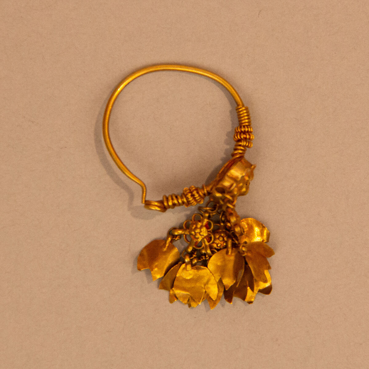 This earring, one of a set of five, is fabricated of gold and contains several floral motifs. Flat, three-petalled flowers make up the pendants at the base of the hoop, while a cast rosette can be seen at the front of the earring. These motifs reference the ancient practice of making ephemeral adornments from flowers.