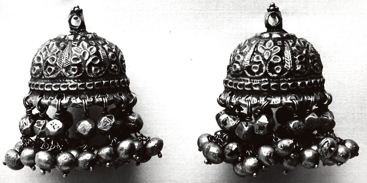 The bell-shaped form of these jewels is known as jhumka. Typically, these are found on ear ornaments, and the loop at top indicates how they originally would have been attached to a chain or a hook. The jewels would have been suspended near the ears of the wearer, and the dangling bead pendants at the bottom would have made a soft noise as the wearer moved.