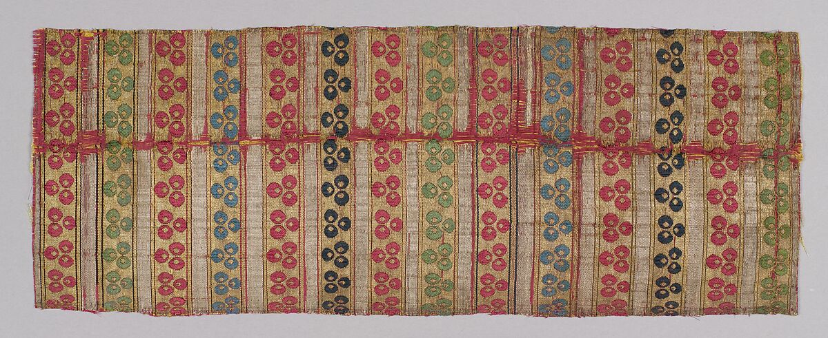 This fragment depicts a rare small-scale version of the design known as chintamani ("auspicious jewel"), which finds its etymology in Sanskrit and usually features three circles or closed crescent forms representing pearls. Also associated with the patterning on animal skins, the circular elements are alternately referenced as leopard spots, and often accompanied by wavy lines representing tiger stripes. In this fine example of seraser, the gold ground of the cloth is accomplished by weft threads comprised of thin strips of silver foil wrapped around a yellow silk core, giving the surface of the cloth its luster.