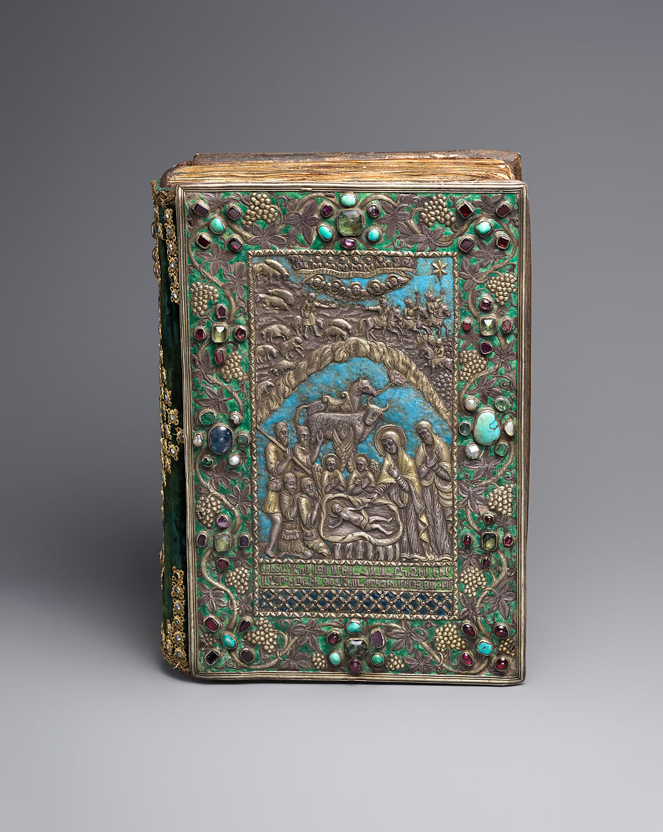These jeweled, enameled, and gilt-silver repoussé covers for a gospel are examples of the work produced in the late seventeenth-century Armenian silversmith workshop of Kayseri. Both front and back cover are signed, informing us that they were made in Kayseri in 1691 by Astuatsatur Shahamir. The central image on the front cover depicts the Adoration of the Shepherds, and above, the magi following the star. Amid angels, the banner in the sky proclaims, "Glory to God in the highest and on Earth peace." The same composition of shepherds appears on two sets of gospel covers made in Kayseri by M. Karapet Malkhas, one dated 1671 (Mekhitarist Library, Vienna, MS 416) and the other dated 1691 (present location unknown). On the back is the Resurrection, showing Christ in a mandorla holding a bannered cross, surrounded by baroque cherubs and clouds. The green velvet spine is decorated with six garnets and numerous glass or crystal gems arranged in a diamond pattern. These covers were attached to a gospel copied and illuminated by a thirteenth-century scribe named Grigor, possibly from Cilicia.