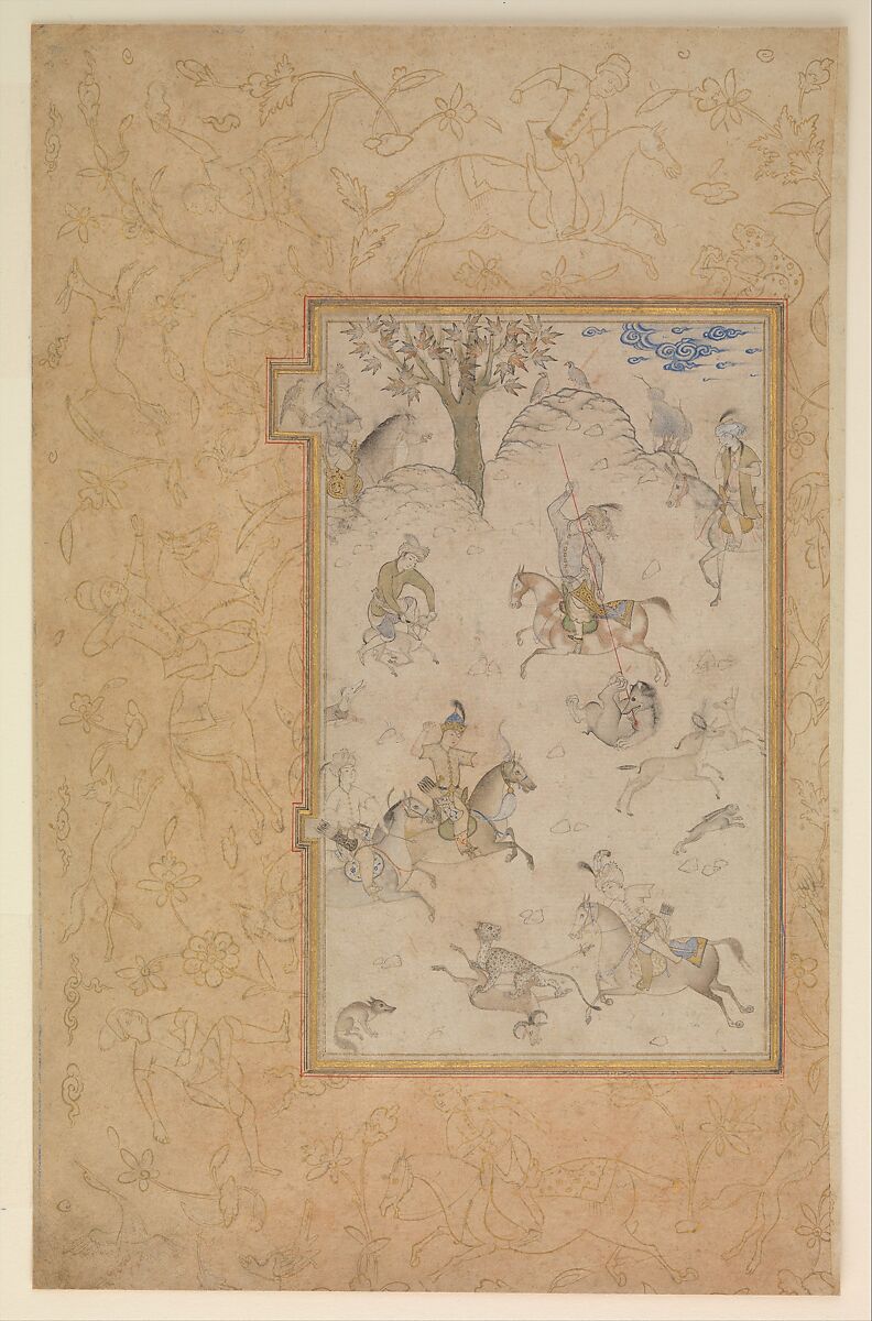 Following the death of Shah Tahmasp in 1576 royal art patronage declined and artists sought outlets other than the court for their works. Artists increasingly made drawings that owners could include in albums that functioned like portable art galleries. One of the most influential masters in this period, Muhammadi of Herat, apparently served the Uzbeks, where he specialized in drawings of princely and rural pursuits in the countryside. Safavid artists, such as the one who drew this hunting scene, were inspired by Muhammadi’s technique and his choice of subject matter, though here the treatment of each figural group as a separate vignette lacks the coordination of Muhammadi’s original works.