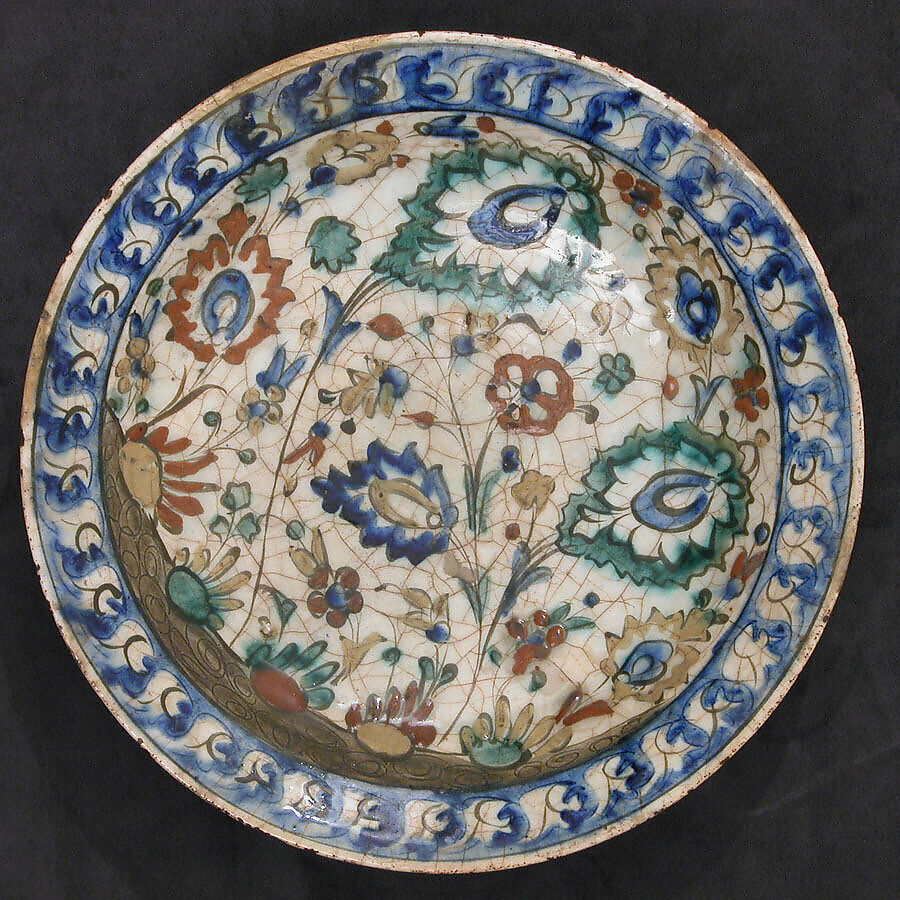 - Medium:Stonepaste; underglaze painted in black, blue, and green with red and yellow slips