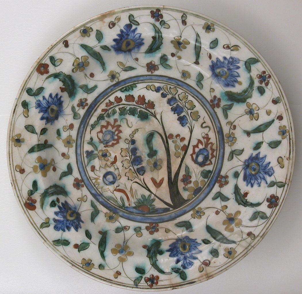 - Medium: Stonepaste; underglaze painted in black, blue, and green with red and yellow slips