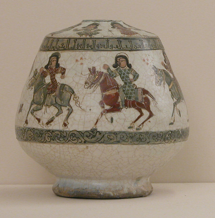 Minai ceramics probably were made for an upscale market, as suggested by the scenes of courtly entertainment that adorn many examples. This piece reveals aspects of customs and clothing, preciously underlined with touches of gold paint.