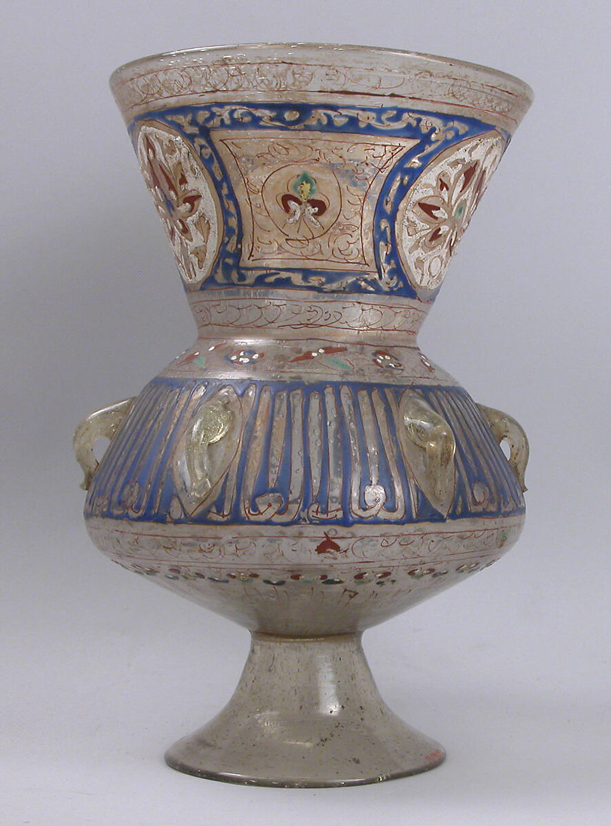 The technique of polychrome enameled glass emerged in the late 12th century, with centers in Syria, Egypt and Northern Mesopotamia. This type of mosque lamp, the somewhat unrefined decoration of which consists of the repetition of the word al-'alim ("the learned") and of the conventional peony design, probably represents objects produced in large number for the market rather than a specific commission. Nonetheless, the market value for enameled glass was certainly high and only affluent individuals could afford it.