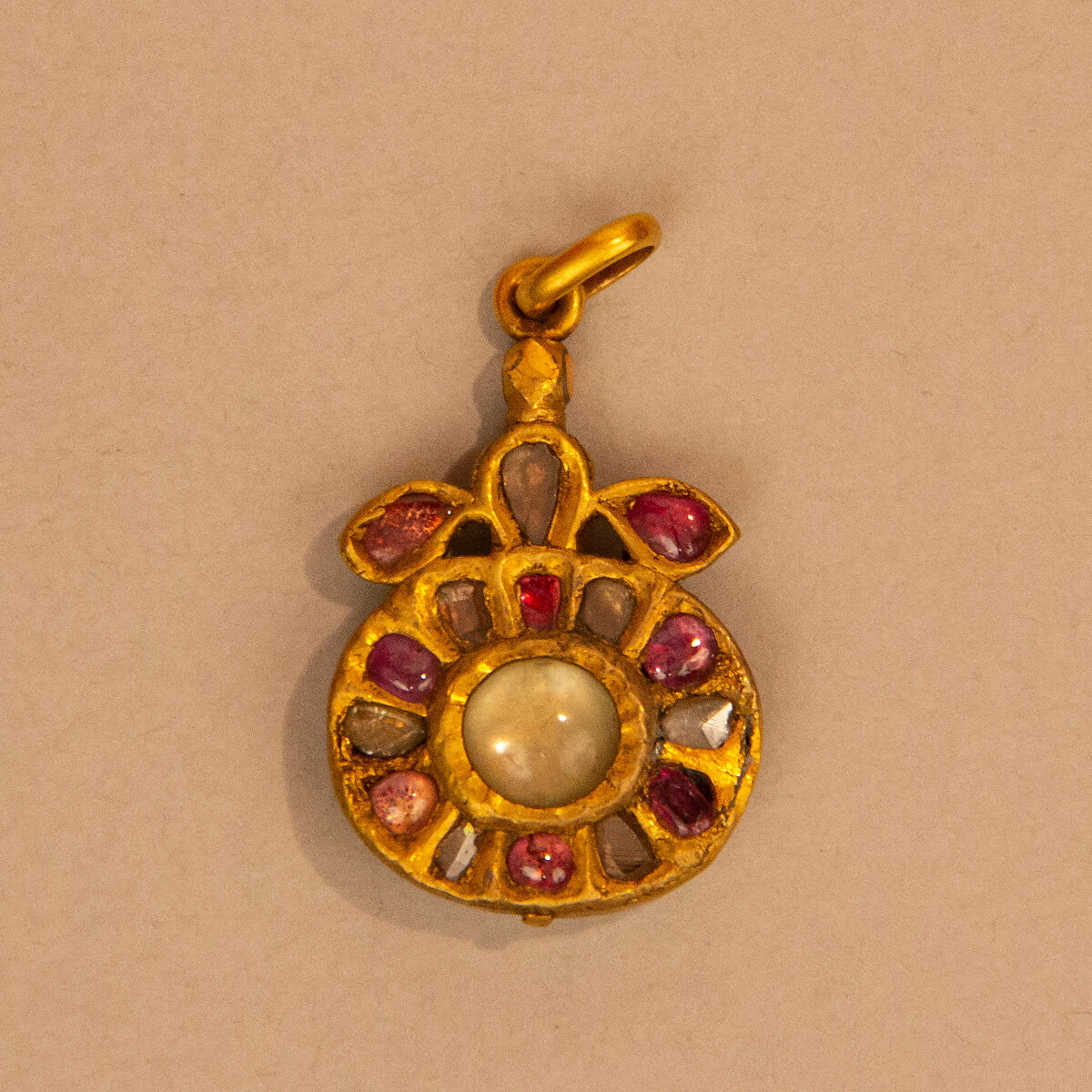This small pendant would have been one of several on a larger, opulent ornament, perhaps worn around the neck or on the head. A range of different species of gemstones are set within a traditional Indian kundan gold mounting.
