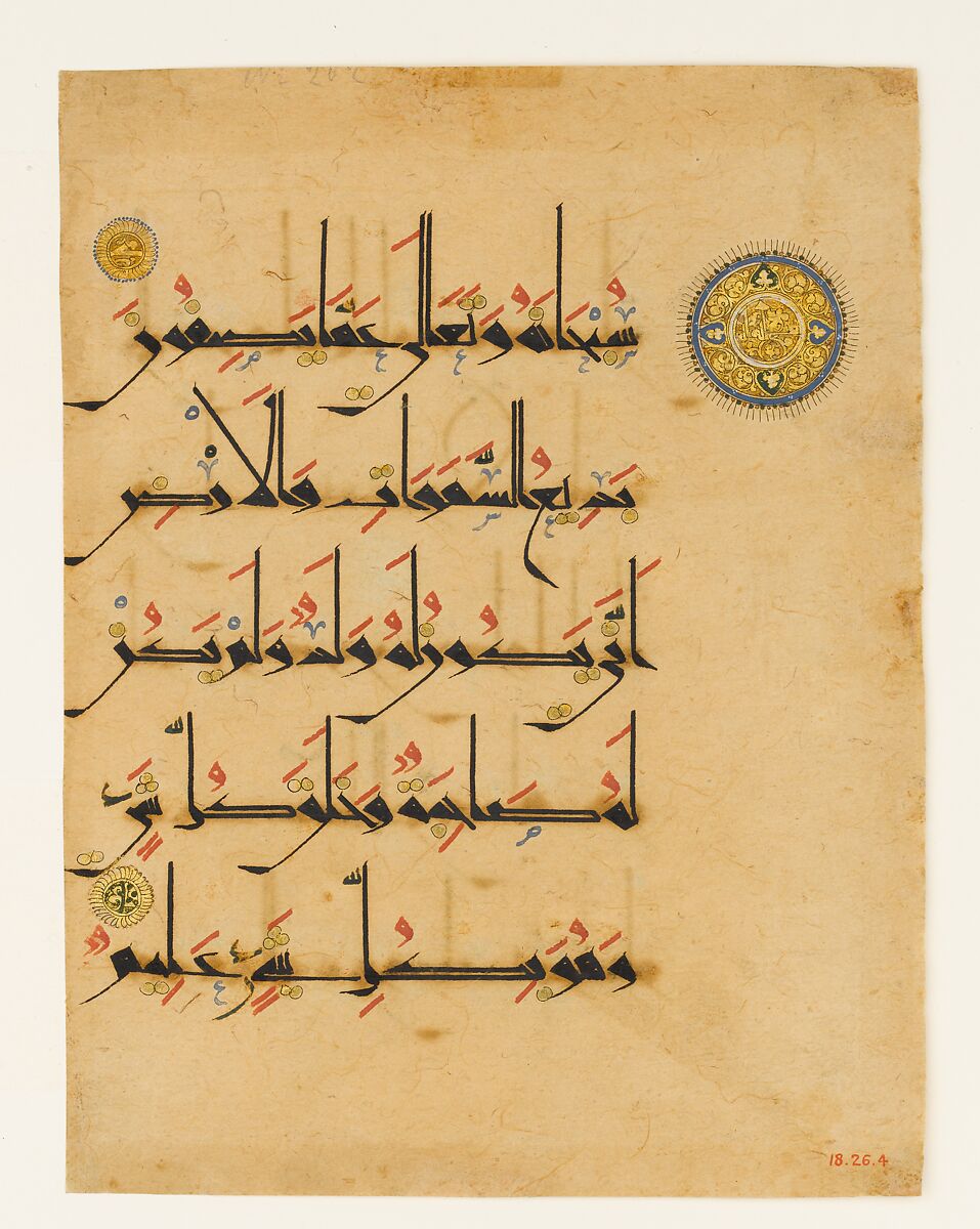 This folio from a Qur’an is written on paper in black new style script, with vocalizations in red, diacritical marks in gold, and other orthographical signs in blue and black. The golden medallions are verse markers: the smaller ones contain letter numerals, while the larger one contains the words "100 verses" encircled by a band of trefoil scrolls, indicating the beginning of the 100th verse of Sura 6 (al-An‘am, "of the Cattle").